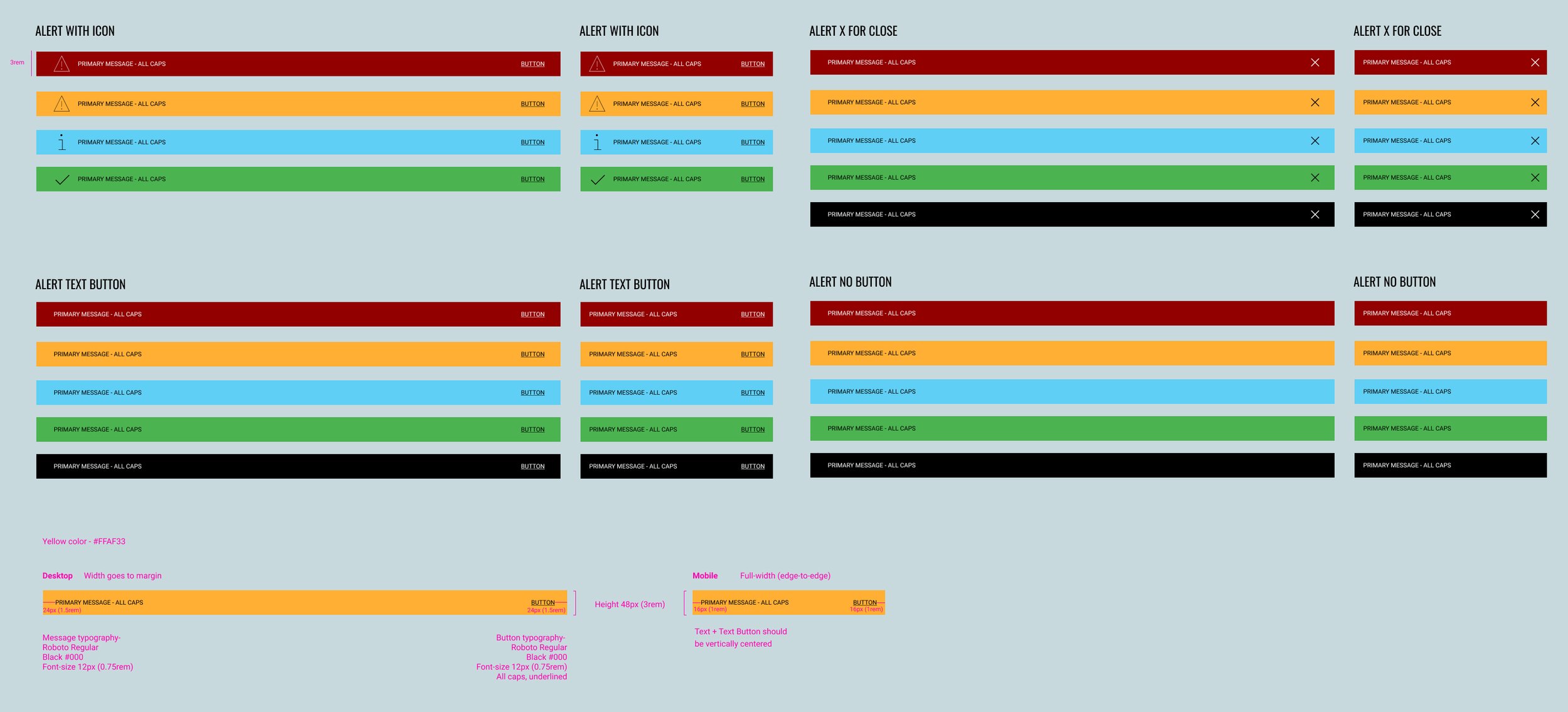 Alert Banner Component: The alert banner component was enhanced to include additional colors, icons, messages, and placement options to support the DRC’s needs.