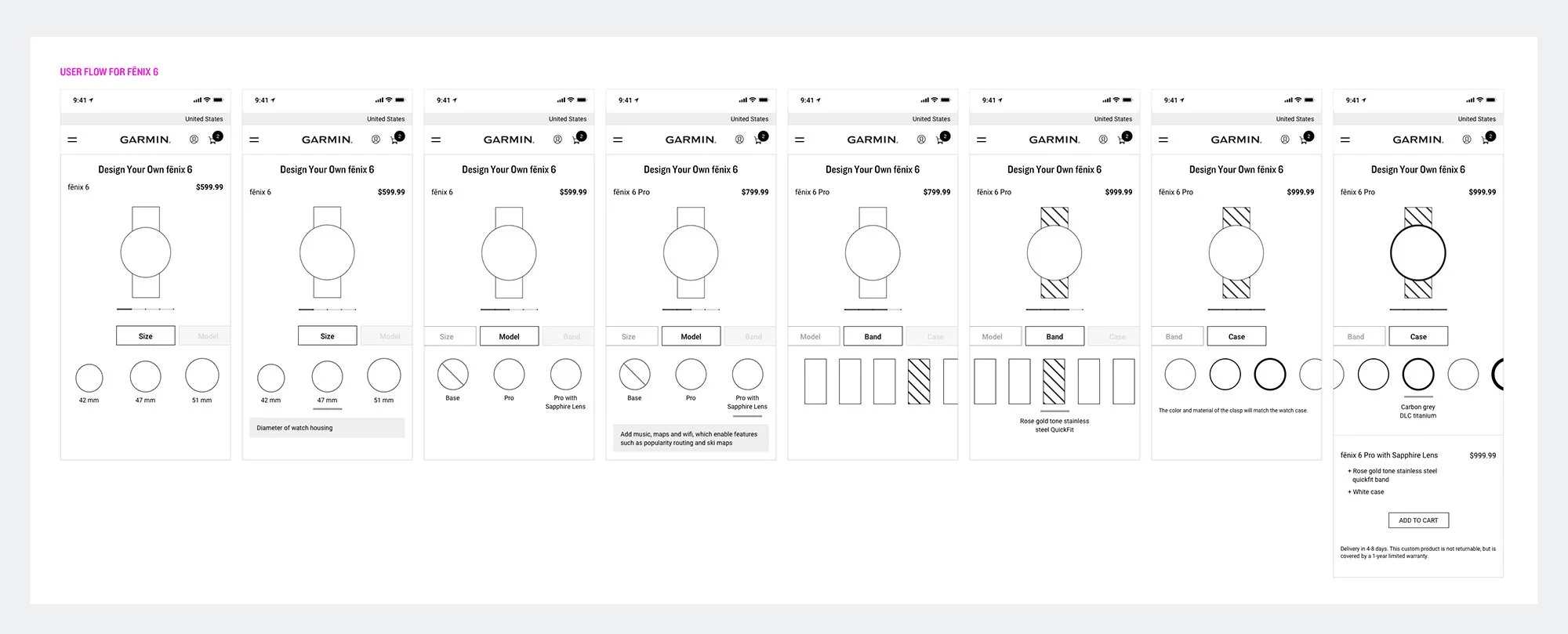 I designed Garmin's first-ever watch builder tool to create a fun, seamless experience for users to design a custom watch to purchase. I effectively wove this product into the Garmin.com purchase funnel, directly resulting in increased revenue for the wearables market.